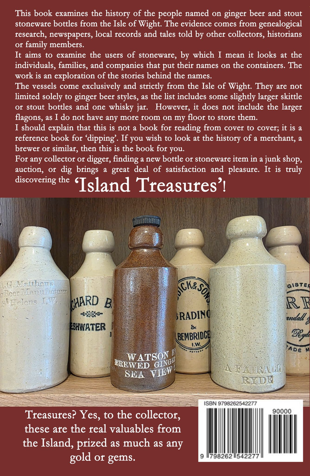 Island Treasures: Recovering the legacy of the Isle of Wight's brewers & Merchants through their stoneware. This book examines the history of the people named on ginger beer and stout stoneware bottles from the Isle of Wight. The evidence comes from genealogical research, newspapers, local records and tales told by other collectors, historians or family members. The work is an exploration of the stories behind the names.