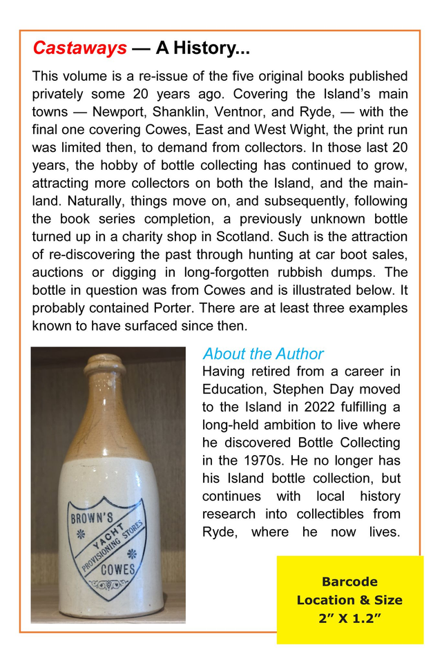 Compendium of Castaways Collectables: A re-issue of the five original books published privately some 20 years ago. Covering the Island’s main towns — Newport, Shanklin, Ventnor, and Ryde, — with the final one covering Cowes, East and West Wight, the print run was limited then, to demand from collectors. In those last 20 years, the hobby of bottle collecting has continued to grow, attracting more collectors on both the Island, and the main-land.